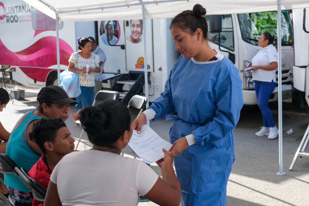 Cancún.- Familias de Villas Otoch Paraíso y alrededores acudieron a las Caravanas Médicas Móviles que se instalaron en las instalaciones de El Faro para recibir atención de calidad y para el cuidado de su salud en Cancún.