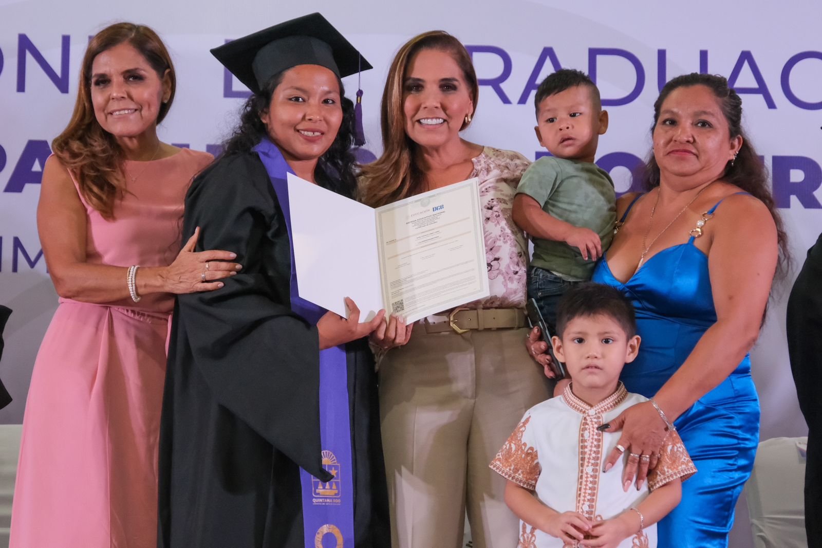La gobernadora Mara Lezama entrega certificados a 50 cancunenses graduadas y graduados de preparatoria, del programa “Mujer es Poder”.